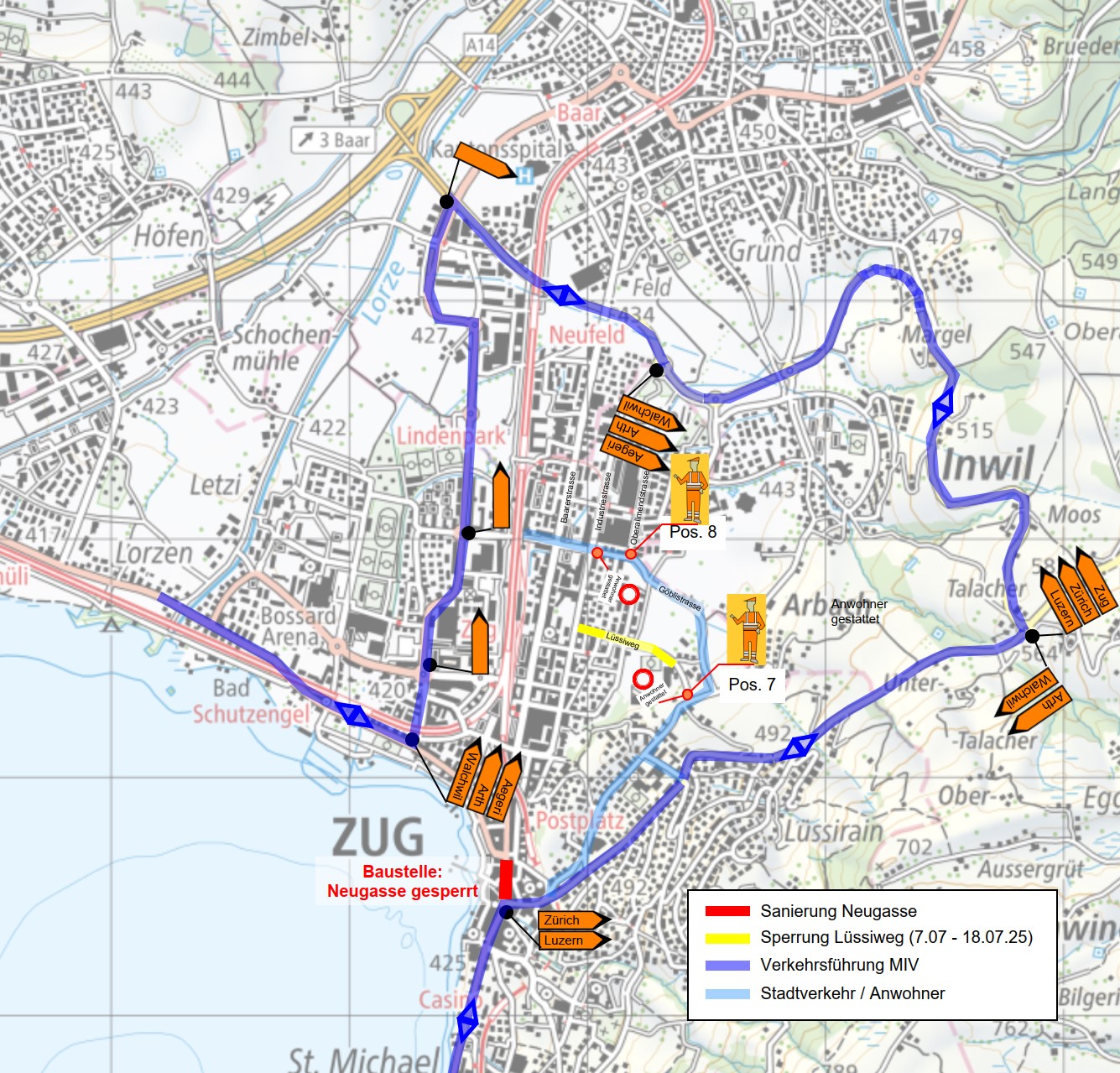 Die Deckschicht in der Neugasse wird durch einen lärmarmen Strassenbelag ersetzt. Dafür muss der Abschnitt vom Postplatz bis Kolinplatz gesperrt werden. Die Zugänge zu den Liegenschaften sind während den Bauarbeiten gewährleistet. Die Verkehrsumleitung für den motorisierten Verkehr erfolgt grossräumig (siehe Umleitungsplan). Die Busse werden über die Zeughausgasse umgeleitet.