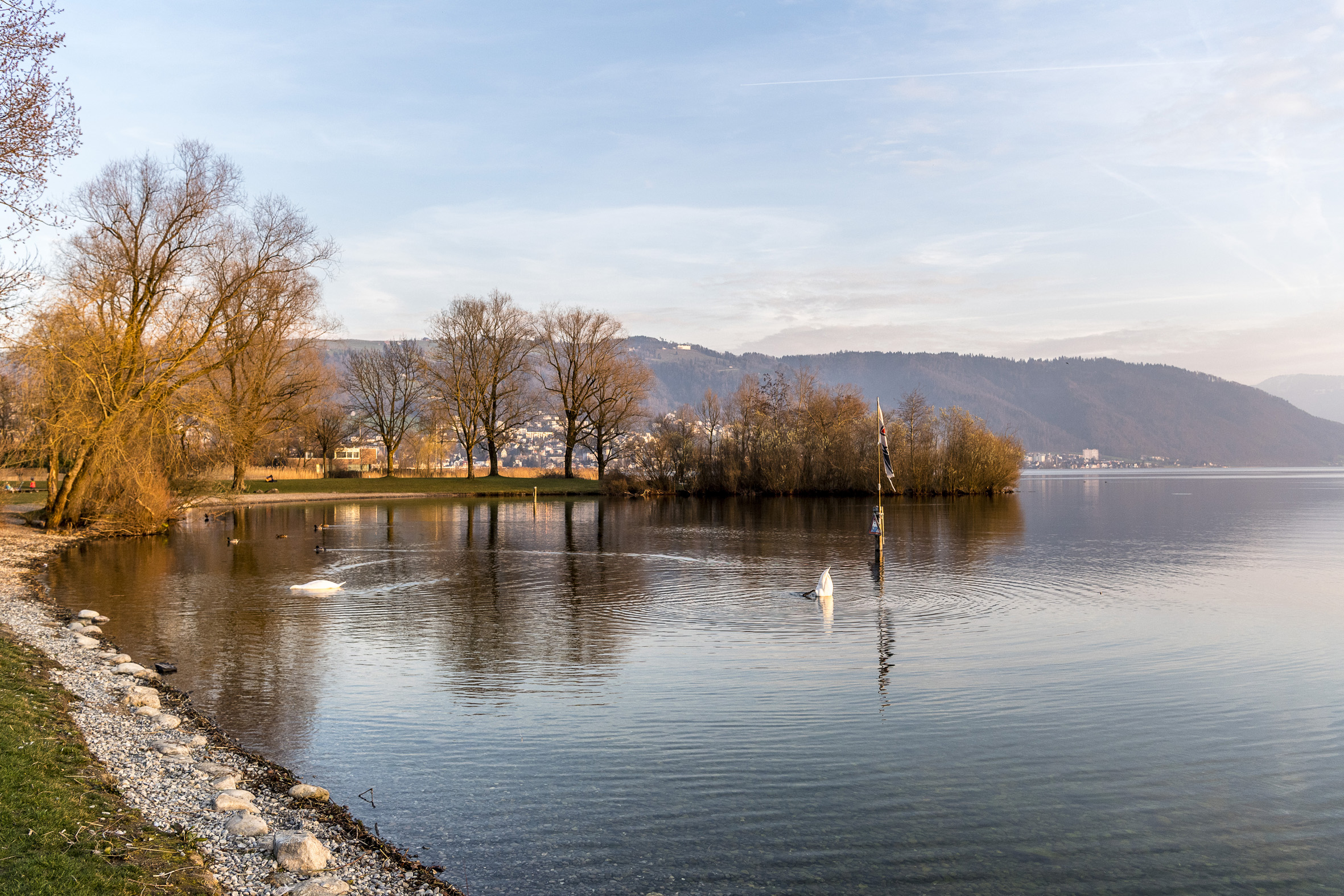 Zusätzlich werden die bestehenden Landzungen unter Wasser mit gezielten Schüttungen lokal vergrössert, um die Strände besser vor Auswaschungen zu schützen. Die strandnahen Strömungen können so umgelenkt und reduziert werden. Ziel ist der verbesserte Schutz des Uferbereichs. Für die Schüttungen wird Geröll aus dem Geschiebe der Lorze sowie aus den Geschiebesammlern des Brunnen-, Müli- und Steinibachs auf Stadtzuger Gebiet verwendet. Die erste Etappe der Instandsetzung erfolgt im Februar 2026.